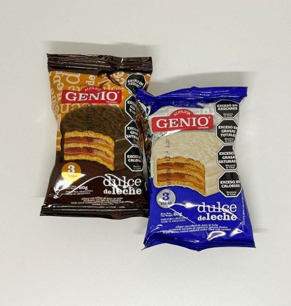 Alfajor relleno de 3 capas con dulce de leche y baño de repostería sabor chocolate negro y sabor chocolate blanco.